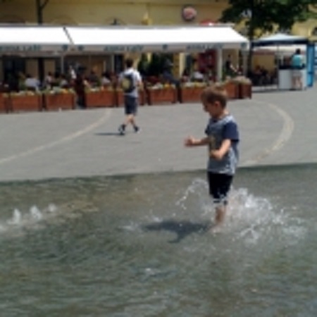 Egy forró júniusi napon Csabi kipróbálta a szökőkutas fürdőzést. Kirándulásból tartottunk hazafelé, kisfiam kérésére megálltunk a Fővám téren, mivel ott is van egy játszótér, amit akkor fedeztünk fel. A játszó mellett van egy szökőkút, ott sétált egy túrista benne mezitlábasan. Ő is szerette volna kipróbálni, így aztán zokni, cipő ledob és mehet a buli. Önfeledten szaladgált, ugrált, rúgta a vizet..